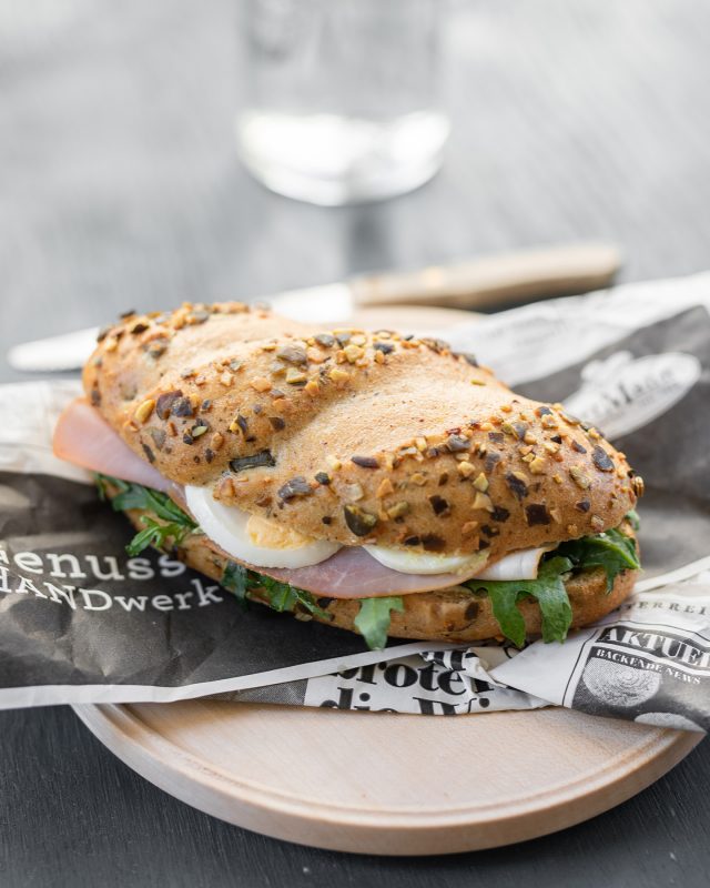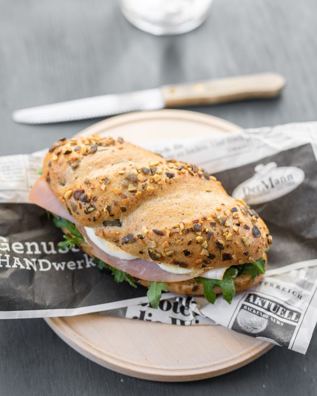Kürbiskernweckerl mit Kürbiskernaufstrich, Rucola, Kürbiskernschinken und Eiern.