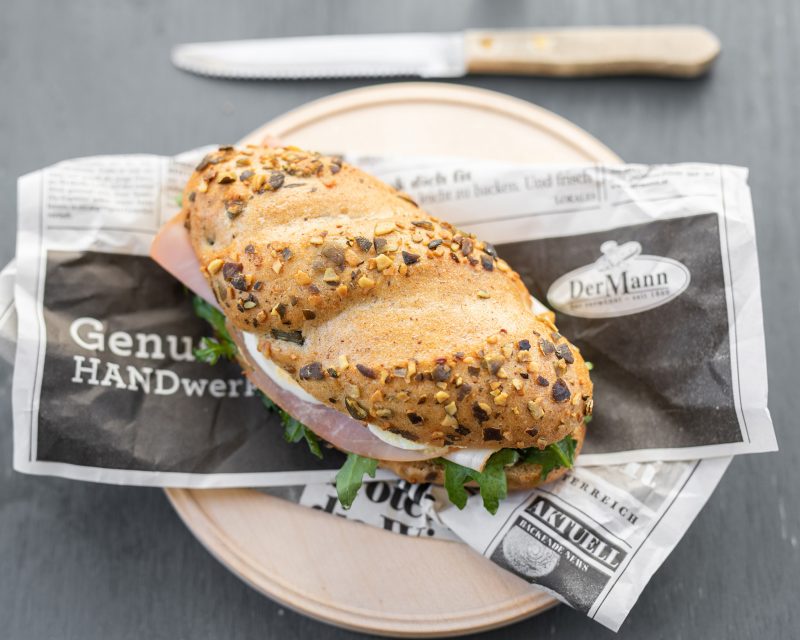 Weckerl: WEIZENMEHL 38%, Trinkwasser, Kürbiskerne 21%, WEIZENVOLLKORNMEHL, ROGGENMEHL, Backmittel (WEIZENMALZMEHL, Verdickungsmittel Guarkernmehl, WEIZENKLEBER, Zucker), Hefe, Speisesalz. Belag: 16% Kürbiskernaufstrich {SPEISETOPFEN, Margarine [Palmfett, pflanzliche Öle (Raps, Sonnenblumen), Emulgatoren (Mono- und Diglyceride von Speisefettsäuren, Lecithine)], Trinkwasser, Kürbiskerne, Kürbiskernöl, Zucker,Speisesalz, Weingeistessig, SENFKORN, Gewürze, Verdickungsmittel (Xanthan, Johannisbrotkernmehl, Tarakernmehl, Guarkernmehl), Dextrose, Konservierungsmittel Kaliumsorbat, Säuerungsmittel (Essigsäure, Milchsäure), Säureregulatoren (Natriumacetate, Natriumcarbonate, modifizierte Stärke)}, Kürbiskernschinken [Schweinefleisch, Speisesalz, Kürbiskerne, Dextrose, Maltodextrin, Säuerungsmittel Natriumcitrat, Aroma, Stabilisator Triphosphat, Konservierungsstoff Natriumnitrit, Antioxidationsmittel Natriumisoascorbat, Buchenrauch, Gewürze), HÜHNEREI, Rucola.