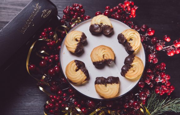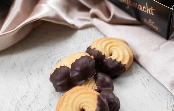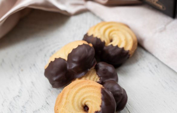 Feine mürbe Kipferln mit Himbeerkonfitüre gefüllt. An den Enden in Schokolade getaucht. Präsentiert in einem edlen Karton.
