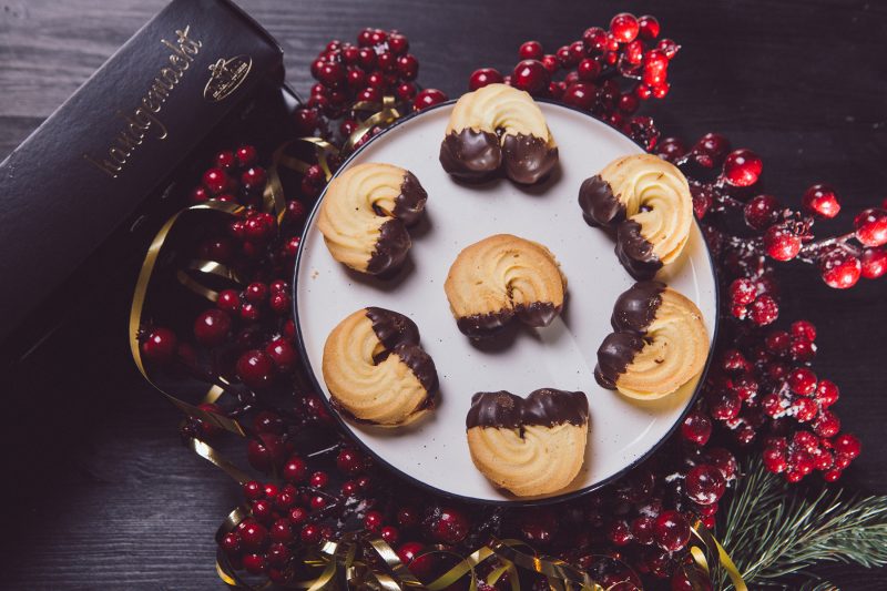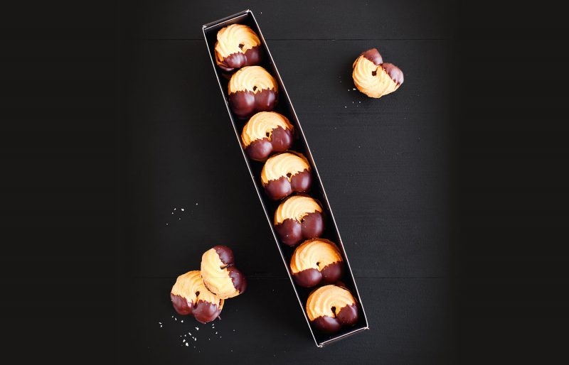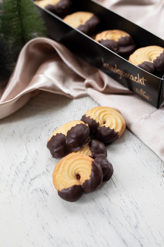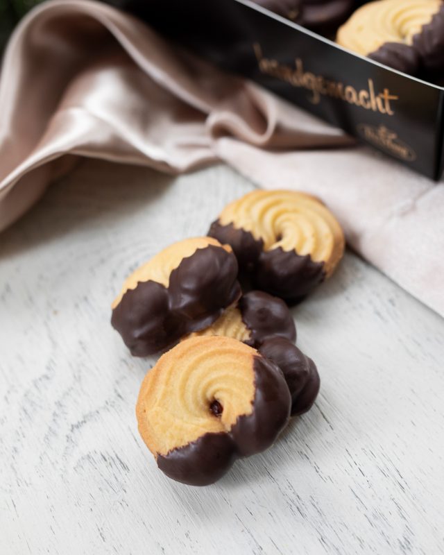 Feine mürbe Kipferln mit Himbeerkonfitüre gefüllt. An den Enden in Schokolade getaucht. Präsentiert in einem edlen Karton.