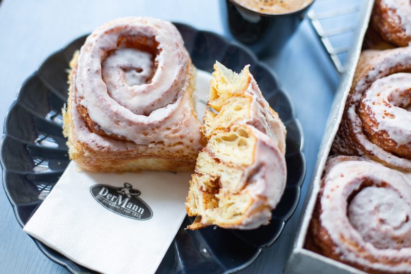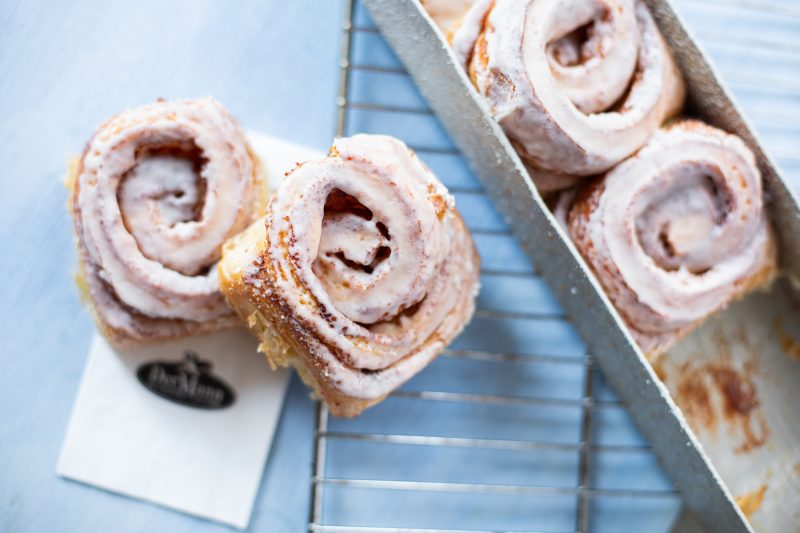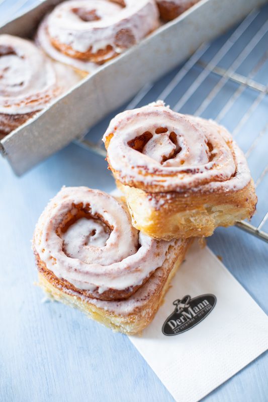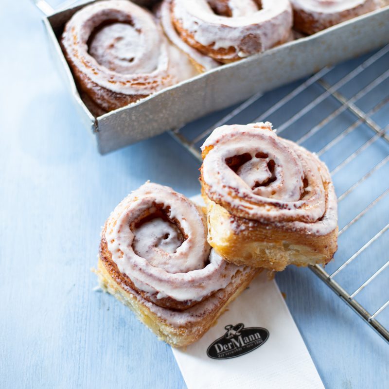 Unser beliebter Butterplunderteig wird mit Butter und Zimtzucker bestrichen und zu einer Schnecke gerollt. Nach dem Backen mit einer Staubzucker-Frischrahm-Zimt-Glasur bestrichen.