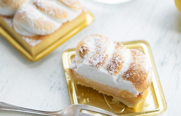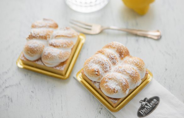 Buttermürbteigschüsserl mit fruchtiger Zitronencreme gefüllt, mit einer Schaumhaube bedeckt und abgeflämmt.