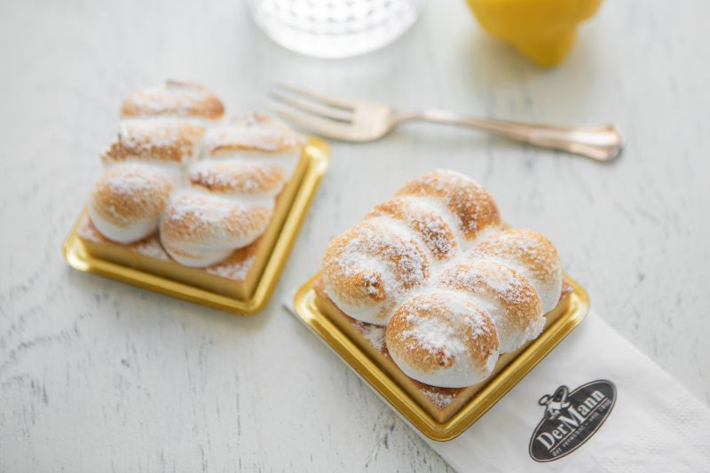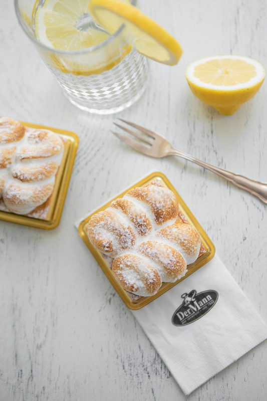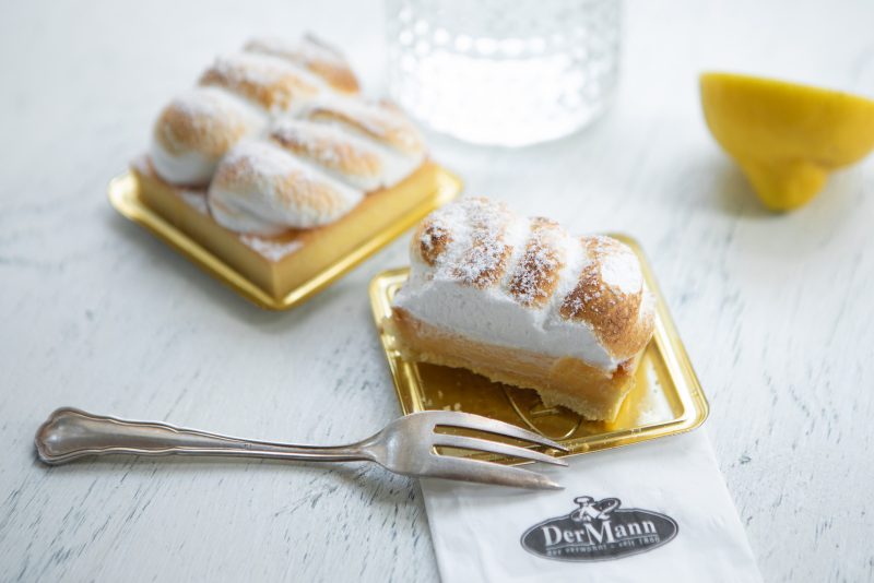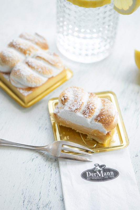 Buttermürbteigschüsserl mit fruchtiger Zitronencreme gefüllt, mit einer Schaumhaube bedeckt und abgeflämmt.